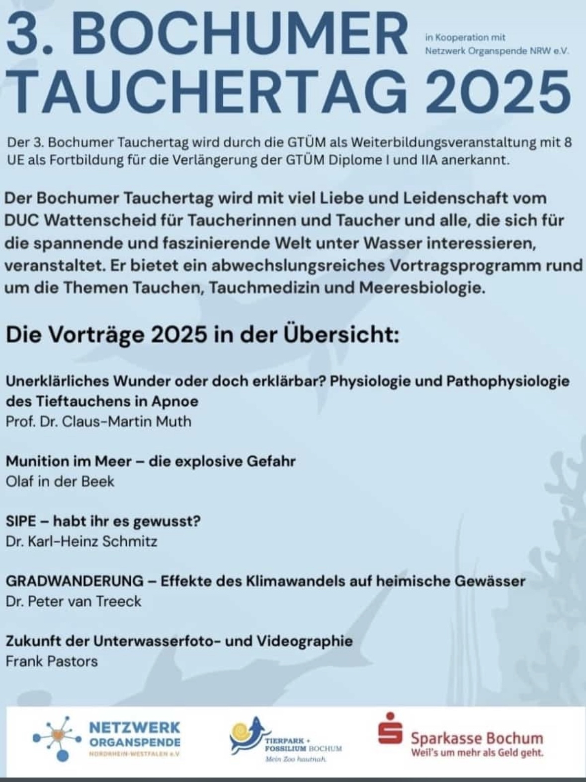 Am Samstag, den 8. November 2025, fand im Tierpark + Fossilium Bochum der vom DUC Wattenscheid organisierte 3. Bochumer Tauchertag statt. Von den Herner Sport-Tauchern reisten 15 Interessierte an, um an den spannenden Vorträgen hochkarätiger Referenten rund um die aktuellen Themen Tauchen, Umwelt und Medizin, teilzunehmen. Zusätzlich förderte diese spannende Weiterbildungsveranstaltung den Austausch und die Vernetzung der Tauchsport-Community.